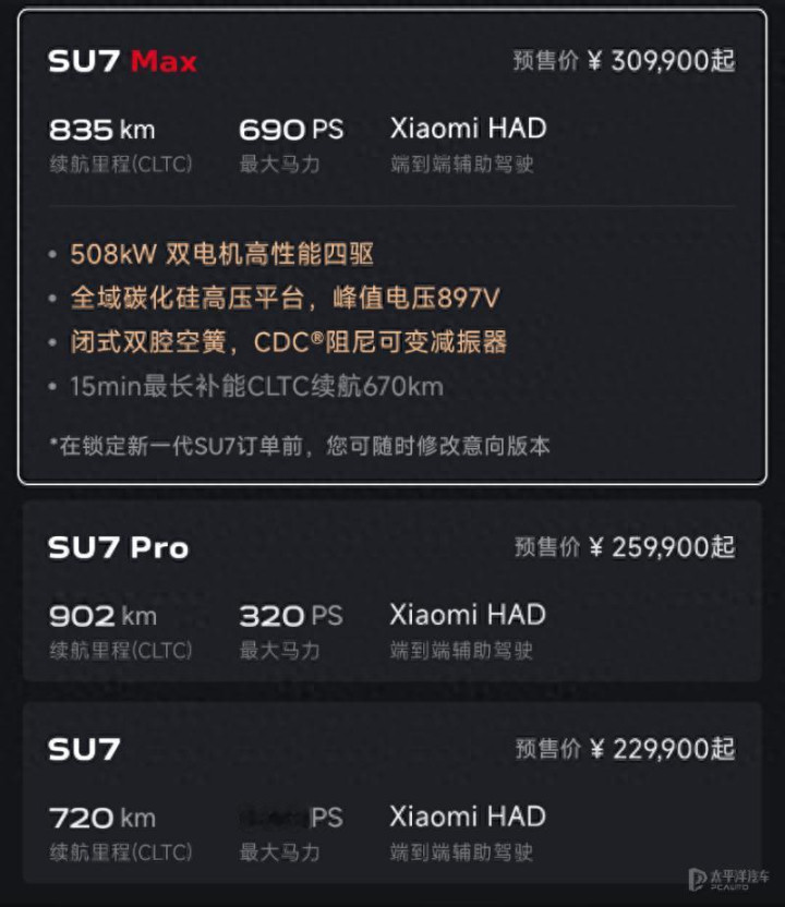 至于价格方面融期策略,按照小米长期贯彻的高性价比战略,预计会与现款车型保持一致,正式上市或维持21.59-29.99万元的售价,你们觉得如何呢?(文:太平洋汽车 吴启星)