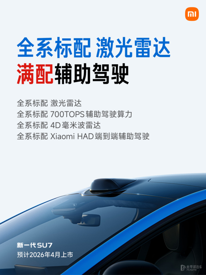 在智能座舱方面,预计将搭载最新澎湃OS车机系统,内置有高通骁龙8 Gen3芯片。在辅助驾驶方面,新一代小米SU7全系标配激光雷达和英伟达Thor-U芯片,硬件预计与小米YU7保持一致,采用11个摄像头、12个超声波雷达、1个4D毫米波雷达共25个智能传感器,可实现高速/城市领航辅助驾驶、全场景智能泊车、主动安全等功能。